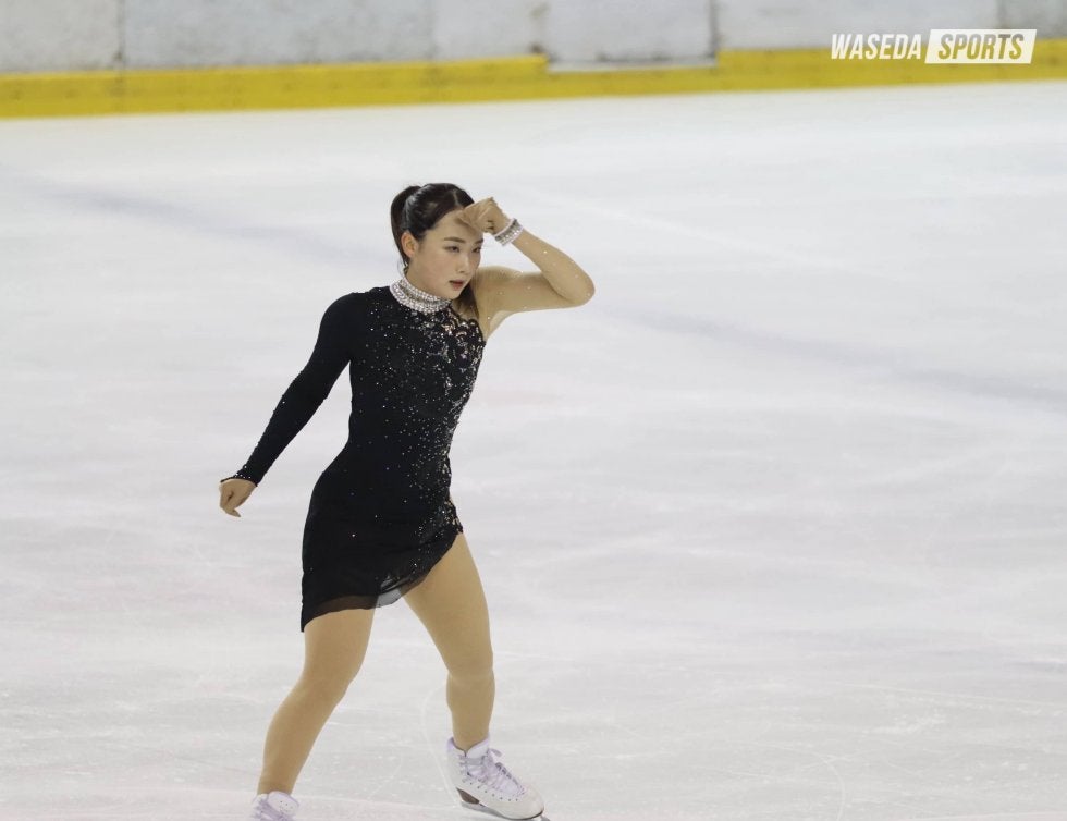 6級女子部門で最後に登場したのは、主務も務める妻鹿。披露したプログラムは昨シーズンも使用していた『Beethoven's Five Secrets』。大きな声援に送り出され、リンク中央に立った。「6分間練習のときにすごく緊張していたが(中略)、それまでに落ち着こうと思った」と話していた通り、落ち着いた様子で丁寧に演技を始める。序盤の3回転トーループは回転が抜けて2回転になってしまったものの、昨シーズンはあまり構成に入れられていなかったジャンプにしっかりと挑んだ。その後は後半のコンビネーションジャンプも含め、大きなミスなくジャンプを着氷。ジャンプやスピンなどのエレメンツの間も丁寧に、繊細な表現を見せ、最後まで滑り切った。得点は56・78点で全体の7位に入り、早大勢トップの順位で大会を終えた。