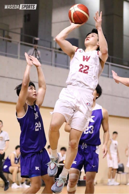 第1Q開始すぐにF三浦健一(スポ1=京都・洛南)、G下山瑛司(スポ1=愛知・中部第一)が連続得点し、先制する。順調に得点を重ね、G高田和幸(商2=京都・洛南)のスリーポイントで点差を2桁差に。しかし第1Q終了間際に相手もスリーポイントを決め返し、24-17と点差を1桁に戻される。第2QはG飯島慶記(人3=茨城・下妻第一)の速攻からの得点でスタート。第2Q中盤、G城戸賢心(スポ1=福岡第一)のバスケットカウントに続き、高田がスリーポイントを沈めて早大が流れをつかむ。直後にスリーポイントを決められるが、高田と三浦が続けてスリーポイントを決め返し、さらに調子を上げていく。点差を離し、46-31で前半を終えた。