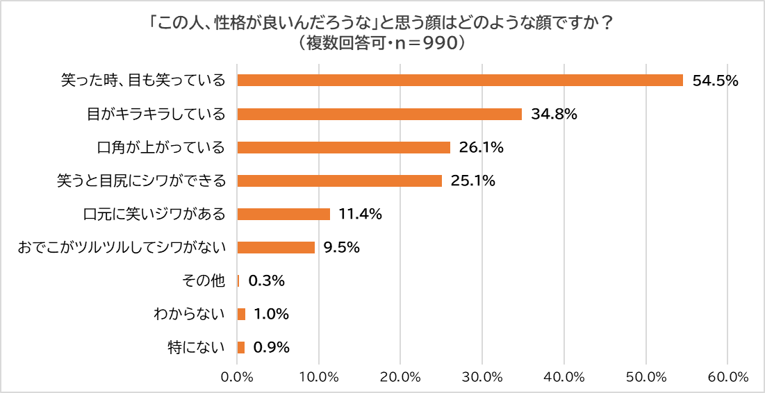 今度は反対に、どのような顔が「性格が良さそうな顔なのか?」尋ねたところ……54.5%が「笑った時、目も笑っている」と回答し最多。