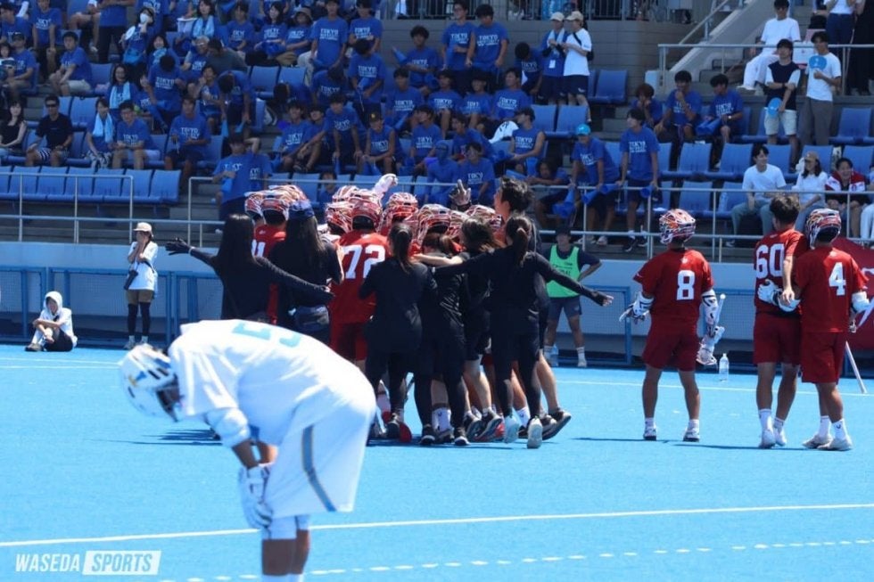 前半はリードの時間帯がなかった早大。勝ち越し点を奪い、流れを引き寄せたいところだった。開始8分には東大の反則によってマンダウン状態(ファウルでフィールドプレイヤーが1人少なくなる状態)に。しかし、慎重に攻めるあまり得点には結びつかず2分後逆に得点を奪われてしまう。さらに13分、ボールを持った選手に早大DFが集中したことでフリーになった他の東大の選手に追加点を献上。悪い流れのまま、始まった第4Qは早大のマンダウン状態に付け込まれ失点し、3点差になってしまった。しかし、RED BATS(早大ラクロス部男子の愛称)は逆転を信じボールを追い続ける。8分にカウンターから相手DFが整っていない隙にフリーになったMF坂がシュートを決め、得点に成功。さらに続くフェイスオフを勝ち取り、敵陣内でボールをつなぐ。相手DFのチェックが甘くなったところでMF森田がゴール上に突き刺すロングシュートを決め1点差に。このまま、早大の流れになるのかと思われたが東大もじっくり時間をかけながらボールを回し、試合終了は刻一刻と近づいた。そして残り時間数分となったところで早大がタイムアウト。試合再開後、早大は自陣ゴールを開ける決死のディフェンスで何としてでもボールを奪いにいく。それが成功し、一気にボールは東大陣内へ。焦った相手DFの反則を誘発し、東大はツーマンダウン状態(ファウルでフィールドプレイヤーが2人少なくなる状態)になる。千載一遇の好機を得た早大はMF西森大基(商4=埼玉・早大本庄)がスタンディングシュートを決め同点に追いついた。ここで会場の熱気は一気に最高潮へ。早大応援団の声援を力に、残りわずかの時間にすべてをかける。直後のフェイスオフでFO高橋一史(法4=東京・早大学院)がボールを勝ち取り、すぐさま前線にパスを供給。フリーになったMF森田が値千金のスタンディングシュートを決め逆転。そして試合終了のホイッスルが会場で鳴り響き、7-6で貴重な勝ち点3を獲得した。