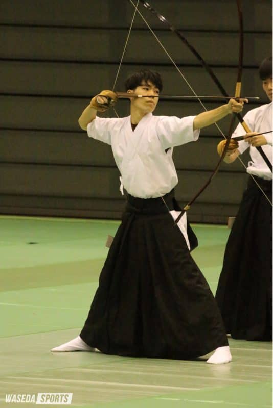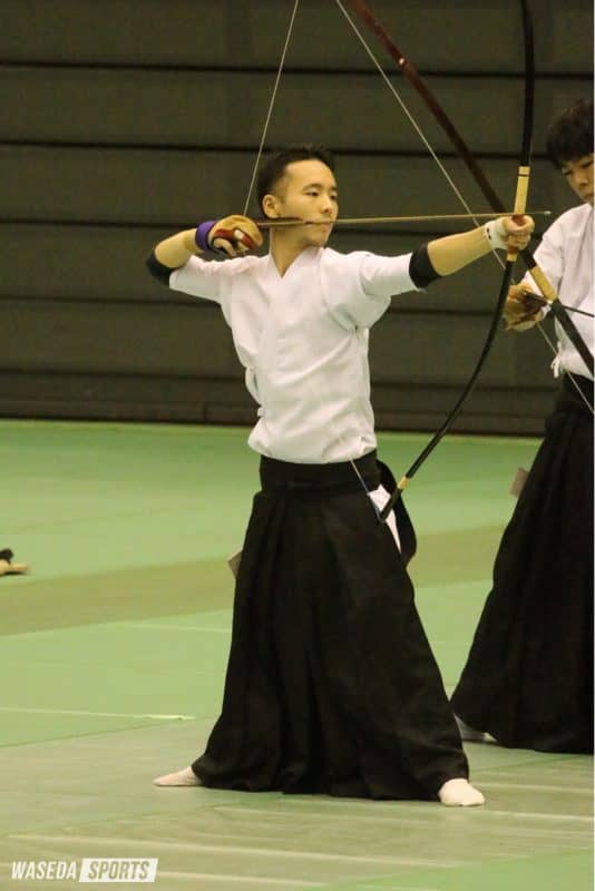 ここで早大は5人中4人が1本目を射止め、いい流れで立を進めていく。その後も一巡で必ず5人のうち4人が的中させていき、着実に的中数を積み重ねていった。そして田沼と佐藤が続けて4本目を当て、この時点でおおよその予選通過ラインと見られていた14中に到達。さらに少しでも上位に進むべく、残り3人で上積みを狙う。河野は惜しくも外したが、竹宇治と宮﨑が的中させ、合計的中数は16中となった。早大では田沼、佐藤、宮﨑が4射皆中と活躍。特に大前の田沼と落の宮﨑は安定感があり、チーム全体の流れを作る射を見せる。また弐的の佐藤も「緊張はめちゃくちゃしました」という中でも、精一杯の射でチームの的中数に大きく貢献した。全ての大学が競技を終え、早大は他2校と並んで同率4位。3年ぶりの予選通過を決めるとともに決勝トーナメントのシード権も獲得し、ベスト16からトーナメントに参加することとなった。