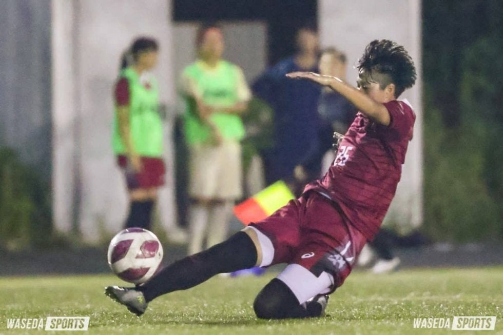 試合は開始早々に動いた。右サイドでMF浦部美月(スポ4=スフィーダ世田谷FCユース)とMF白井美羽(スポ3=ノジマステラ神奈川相模原ドゥーエ)のパス交換から、MF宗形みなみ(スポ2=マイナビ仙台レディースユース)が受ける。その宗形からゴール前に走りこんだ笠原にパスが出ると、キーパーとの一対一を鮮やかに左足ループで制し1-0。この1点で勢いに乗ったア女はその後も攻勢に出続ける。8分に白井、9分には宗形が際どいミドルシュートを放つが、いずれもゴールとはならず。10分、前線で三谷が相手ディフェンダーからボールを奪うと、逆サイドに飛び出してきた崎岡にパス。「中に走っていって、後は良いボールが来たので決め切るだけだった」(崎岡)と、トラップからシュートまで落ち着いたフィニッシュワークで決めきった。今季課題とされていた立ち上がりでの見事な2得点。しかしこのような展開の中でも、ア女に気を緩める様子は一切なかった。35分には左サイド深みで混戦になったところを拾われクロスを上げられたが、DF堀内璃子(スポ4=宮城・常盤木学園)が体を張ってブロック。追加タイムにも相手コーナーキックから際どいボールが上がるが、シュートは打たせなかった。