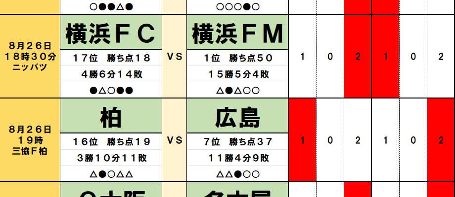 8月26日「J試合勝敗予想」横浜FCは横浜FM相手の「無敗継続」へ!J2の「ダービー」では「6連続ドロー」の可能性