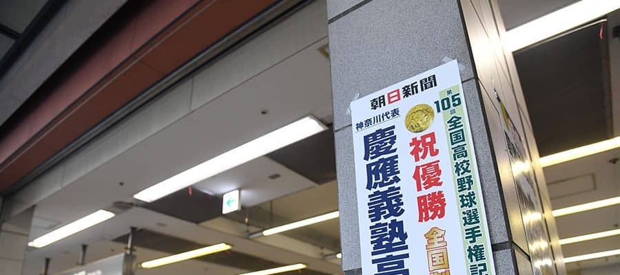 第105回全国高校野球選手権で1916年の第2回大会以来、107年ぶり2度目の優勝を果たした慶応(神奈川)。快挙から2日経った今も、地元の日吉駅ではVフィーバーが続いている。東急電鉄からは電車の発着を知らせる電光掲示板にお祝いメッセージが流れ、飲食店街が連なる通称“ひようら”では、優勝セールで値引きする店が続出。いたるところで通行人が足を止め、スマートフォンを掲げていた。