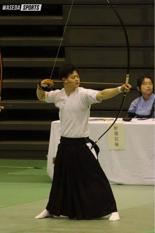 続いて行われた男子個人戦には早大から神山勝冴(創理2=東京・早大学院)、竹宇治雄介(政経3=東京・早実)、小熊悠人(政経4=東京・早大学院)、黒羽航平(文構4=東京・早大学院)、東海枝航平主将(スポ4=埼玉・県浦和)、田沼翔太副将(スポ4=東京・桜修館中教校)、渡部瞭太(文3=東京・海城)の合計7人が出場した。尺二1本目を通過したのは、神山と黒羽、渡部の3人。続く尺二2本目終了時点で残っている早大選手は渡部のみとなった。最後のインカレを「楽しく引こう」と臨んでいた渡部。尺二3本目も的中させ、射止めれば入賞が近づく八寸1本目に進む。「感覚は悪くなかった」という一射だったが惜しくも的に入ることはなく、この1本で早大勢のインカレでの射が全て終了した。