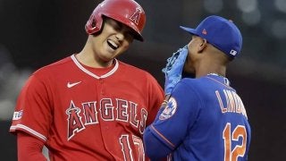 相手野手のリンドーアと談笑をする大谷。そんなコミカルにやり取りをするスターは、敵地でも人気の的だ。(C)Getty Im…