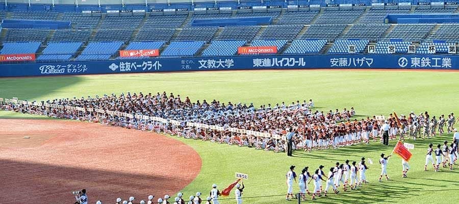 8月5日、明治神宮野球場であった開会式はコロナ禍前と同様に、47都道府県の代表(北海道2枠、東京は開催地枠含め3枠)と、前年度優勝枠を加えた51チームが晴れて入場行進。この時に目立ったのが、長い隊列と乏しい隊列との差。要するに、選手数のバラつきが顕著だった。