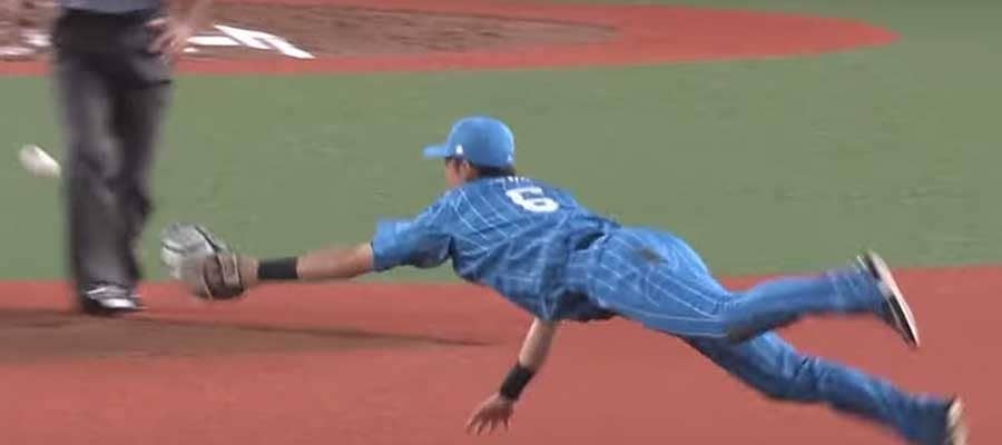 源田は二遊間の打球に飛び込み、体を投げ出しながら正確なグラブトス