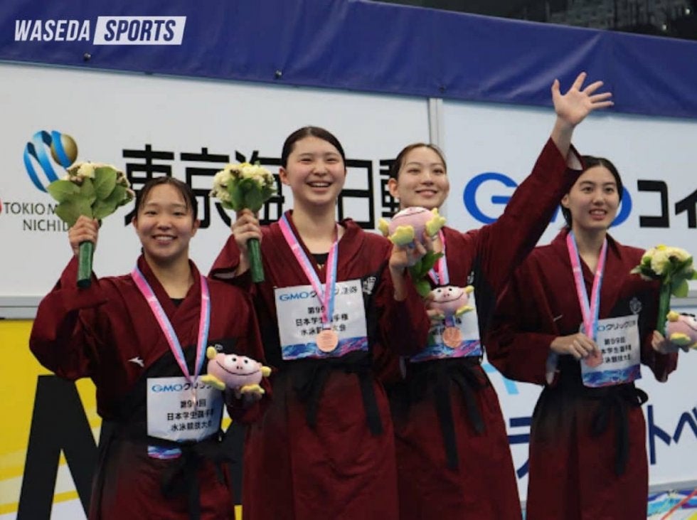獲得ポイントが個人種目の2倍となり順位に大きく関わってくるリレー種目、その一つ目となる4×100メートルフリーリレーが行われた。女子の予選は第一泳者から、今大会初レースの松本信歩(スポ3=東学大付)、今季自由形から背泳ぎに転向している柴田菜摘(商1=東京・早実)、この大会で競技引退となる今牧まりあ(スポ4=長野・飯田)、今大会100メートル自由形5位入賞の船越彩椰(スポ2=東京・淑徳巣鴨)というメンバーで臨む。予選最終5組に登場し、スタートからすぐに隣を泳ぐ中京大と競り合うかたちになる。松本が自己ベストを出して2位で帰ってくると、続く柴田が中京大をかわして1位で今牧へ。前半から積極的な泳ぎを見せ、後半の中京大からの追い上げからも逃げ切り、1位のまま船越にバトンタッチする。船越は中京大のアンカーに先頭を譲るも、しっかり2位でゴールし、全体3位で決勝に駒を進めた。男子予選は1年生の山口遼大(スポ1=東京・暁星)を一番手に起用し、続いて今大会100メートル自由形7位の須田悠介(スポ4=神奈川・湘南工大付)、今大会これが最初のレースとなった菅野遼(スポ4=大分・佐伯鶴城)、アンカーに100メートル自由形連覇の田中を入れてチームを組んだ。山口が組5位で須田につなぐと、一時7位まで順位を落としたが最終的に須田が2位で帰ってくる。菅野は前半から飛ばしていき、50メートルのターンで1位。その後菅野は僅かに遅れ、2位で田中にまわっていく。田中は入水からすぐに後続を離していき組1位でゴール。しかし全体では4位での決勝進出となった。