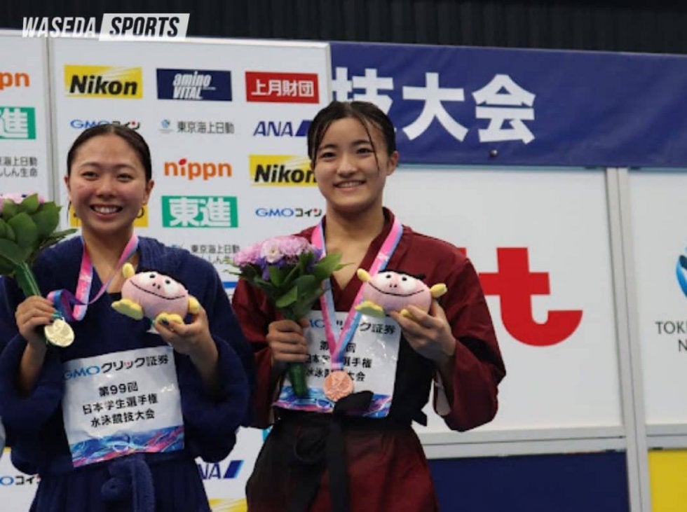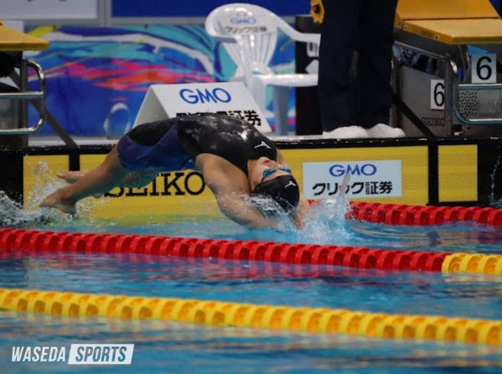 女子100メートル背泳ぎには、亀井が後輩の柴田菜摘(商1=東京・早実)とともに出場した。亀井は浮き上がりからすっと前に出ると、前半の50メートルは腕の回転数も多く、積極的なレースを展開する。折り返してバサロキックでさらに差をつけるが、残り25メートルほどで隣の選手に並ばれてしまう。そこからは並んで最後まで泳ぎ、同着で1位。全体では2位タイに入って、決勝に駒を進めた。柴田は予選11位でB決勝に回っていく。