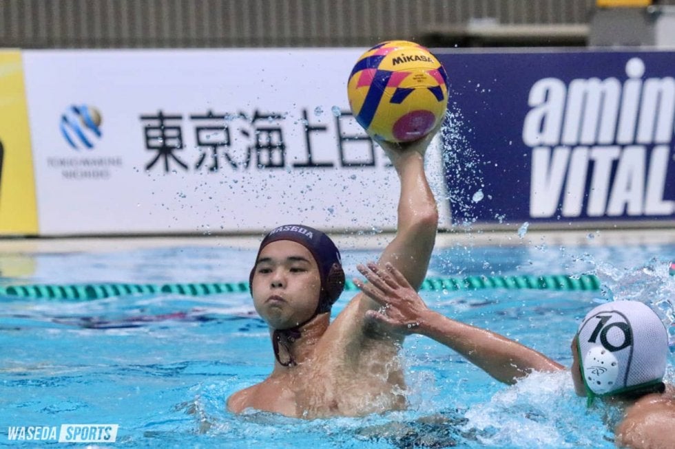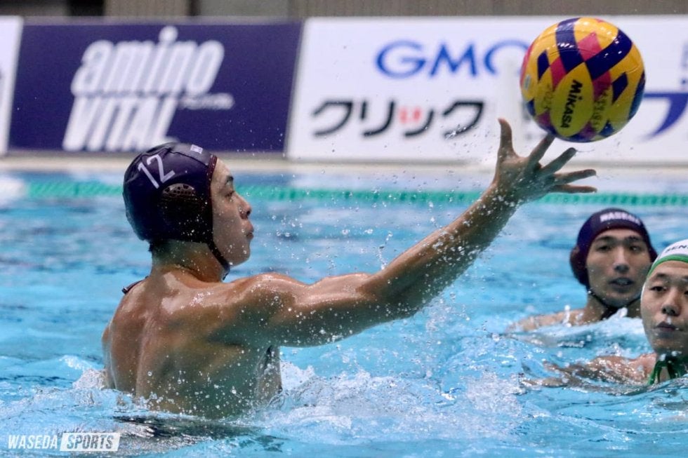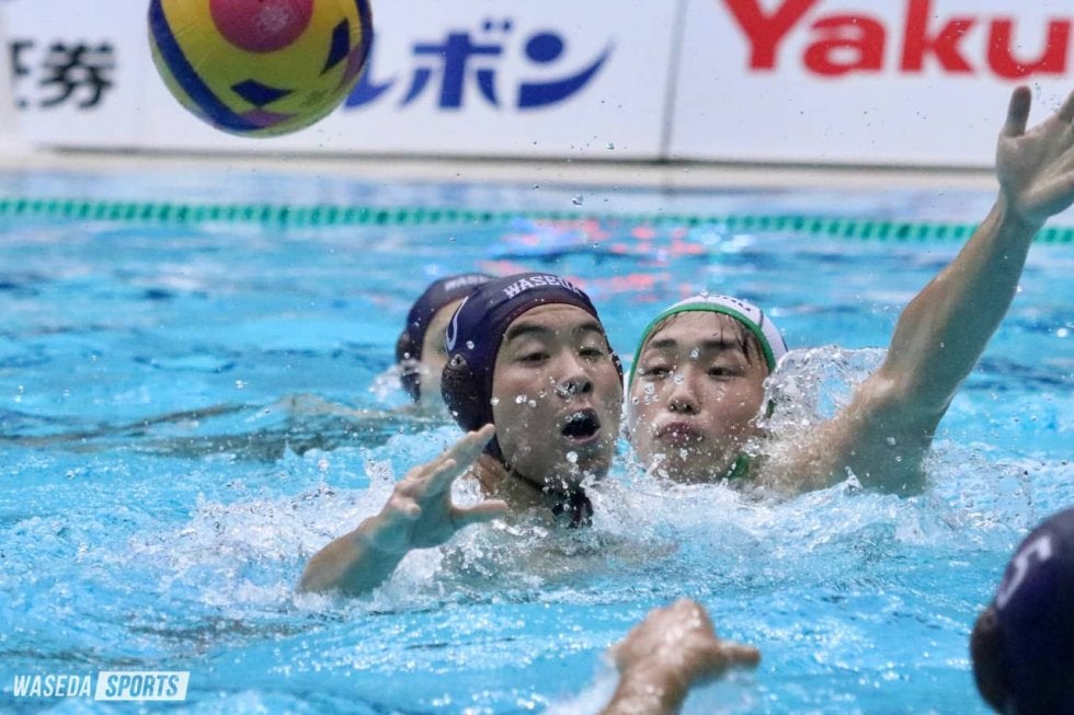第2P1分、またも専大にゴールの角を突く巧みなゴールを決められると、直後にもペナルティースローを与えてしまい、連続失点。一方の早大はなかなか得点に至らない中、ようやく3分、この空気感を断ちきる。GK加納(凪)からプール中央付近で都田がボールを受け取ると、ゆっくりと状況を見定め、加納(恒)にパス。若干遠めの位置からバウンドシュートを華麗に決め入れ、流れを引き寄せた。そして5分半には早大の退水から得点を許すも、すぐさま曳地を軸としたパス回しからチャンスメイク。中村が水面から腕だけを伸ばして高速シュートを投げ込み、会場は大歓声に包まれた。こうして終始粘りを見せ続け、2ー4で前半を折り返した。