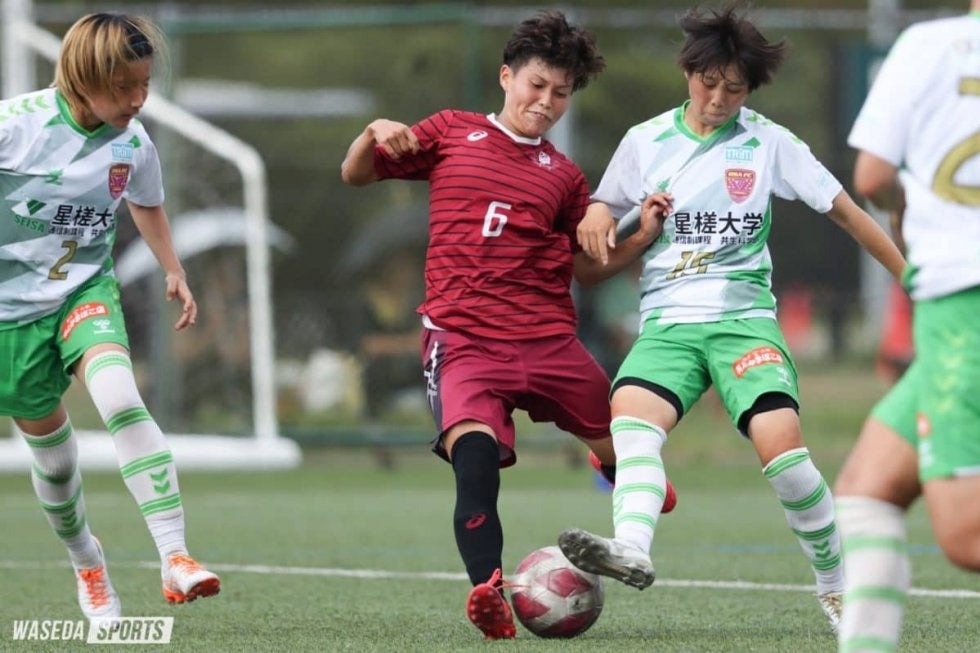 ア女にとって今季初の、トーナメント形式のコンペティションが始まった。負ければ終わり、というプレッシャーがかかる大事なトーナメント初戦とあって、「感覚的には今までの試合で1番緊張していた」と指揮官。40分ハーフという皇后杯予選特有のレギュレーションとなった試合序盤は、少し動きに固さがあり、前線からのプレスがなかなかはまらない。それでもクーリングブレイク後は、山梨学院大戦(関カレ後期第4節、8月27日、●1-2)でも見られたプレー強度を存分に発揮。24分には宗形からのスルーパスに抜け出したFW﨑岡由真(スポ1=埼玉・浦和レッズレディースユース)がシュートを放つが、惜しくもキーパーに防がれた。26分には逆にピンチを迎えるシーンも。クリアミスをゴール前に運ばれシュートを許したが、ディフェンス陣が体を張って防いだ。32分には右サイドからMF浦部美月(スポ4=スフィーダ世田谷FCユース)がエリア内に切り込んだが、惜しくもシュート寸前でブロックされる。35分には崎岡が、浦部からのパスを後ろ足で引っ掛けるように巧みにコントロールして運び、そのままシュートを放つが相手キーパーに防がれた。そして連続でチャンスを作った前半終了間際、待望の先制点が生まれる。39分、浦部のパスを受けた宗形が、キレのあるドリブルで中にカットイン。慌てて囲い込む相手ディフェンダーをものともせずに左足を振り抜き、1-0とした。