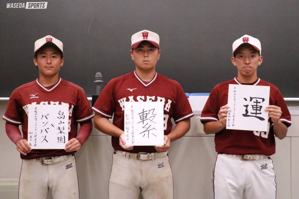 第7回は一二塁間を守る3人。プレーやチームの勝利に対し、強いこだわりを持つ稲井宏平副将(法4=埼玉・早大本庄)、服部耕太郎(スポ3=東京・本郷)、畠山陸(スポ3=高知・高知西)の3人に一年間の振り返りと全日本大学選手権(インカレ)への意気込みを伺った。