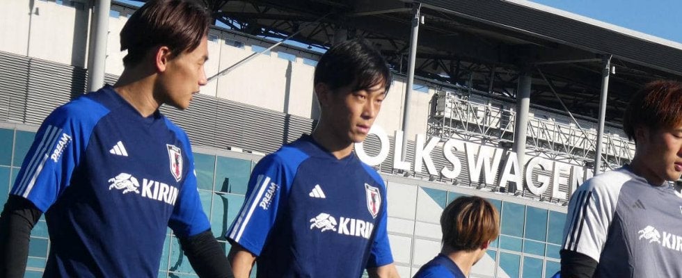 9月4日(日本時間5日未明)の夕方、ドイツ・ヴォルフスブルクで行われた日本代表・9月シリーズの練習初日の冒頭ミーティング。初招集の毎熊が森保一監督に促されて中央に立ち、少しはにかみながら挨拶した。