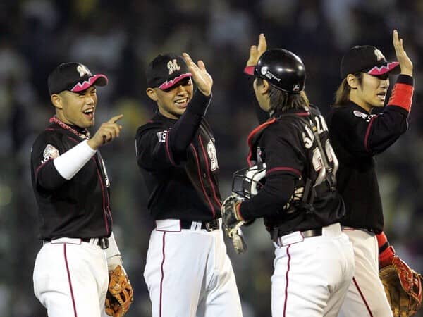 福浦和也(左から2番目)の満塁弾などで、2005年の日本シリーズ第3戦を制したロッテナイン