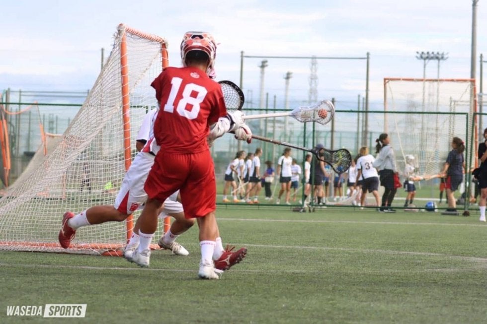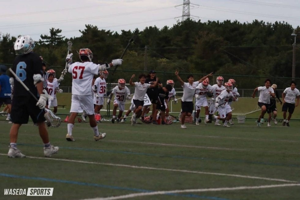 1回戦の相手は法大。早大αはフェイスオフでボールを奪うとじっくりと攻撃を組み立てる。するとコート中央でパスを受けたMF三戸優也(商1=東京・早実)がシュートを決め、先制点を挙げた。しかし、直後に法大もゴールを奪い同点に。さらに2点目を追加され逆転を許してしまう。悪い流れの中で前半残り2分、MF三戸が相手DFのチェックを受けながら同点弾を決める。しかし再開後すぐに得点を返され、2―3で前半を終えた。負ければ即敗退という緊張感の中で迎えた後半。AT吉田宗一郎(教1=東京・早実)、MF山田伊織(国教1=早稲田佐賀)が立て続けに得点を奪い逆転に成功した。しかし食い下がる法大にまたしても同点に追いつかれ、さらに試合終了間際相手選手のシュートが早大ゴールのバーをたたく。絶体絶命のピンチだったが、法大が前がかりになった隙にAT吉田がブレークから勝ち越し点を決め試合終了。5―4で2回戦へと駒を進めた。