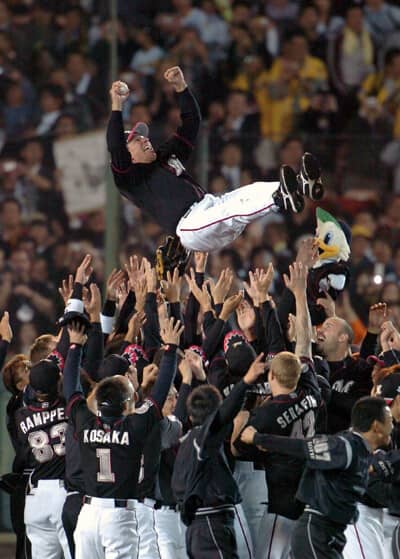 2005年日本シリーズ第4戦に勝利して日本一になり、胴上げされるバレンタイン監督