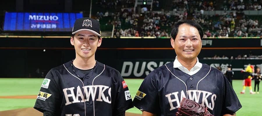 ソフトバンク・板東湧梧(左)と球団OBの攝津正氏【写真:竹村岳】