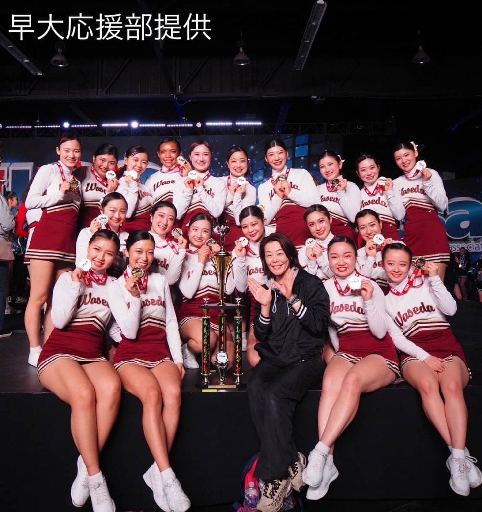 2月に出場した「USA Collegiate Championships」はアメリカ・アナハイム開催の世界大会。昨年8月に開催された国内大会「USA Japan チアリーディング&ダンス学生選手権大会 EAST」での好成績を受け、招待されることとなった。そのため、チームも昨年夏の大会のAチーム(Elites)メンバーで編成。引退した昨年度執行委員の一部メンバーが引退後に大会に出場するという、異例の編成となった。また、世界大会出場はBIGBEARS史上初の快挙。計20人が海を渡り、開催地・アメリカへ向かった。BIGBEARSは「USA Collegiate Championships」のCollege 4-Year All Girl Show Cheer部門に出場。現地校を中心に計3校との対戦となった。今回の演技では、チアリーディングの本場にふさわしいハイレベルな技と日本らしい演技を意識。スタンツの中でも難関とされる「ピラミッド」や、空手を表現したダンスを取り入れた。さらに、国内の大会では新型コロナウイルスの影響により、しばらく実現していなかった観客とのコールアンドレスポンスも実現。コールパートになると自らの肉声でさけび、観客からのレスポンスを意識してポンポンやボールの使い方にも工夫を凝らした。「みんなが後悔なく終われたと思います」と林莉乃チームキャプテン(政経4=東京・頌栄女学院)。初の世界大会で4チーム中2位の好成績を収めた。