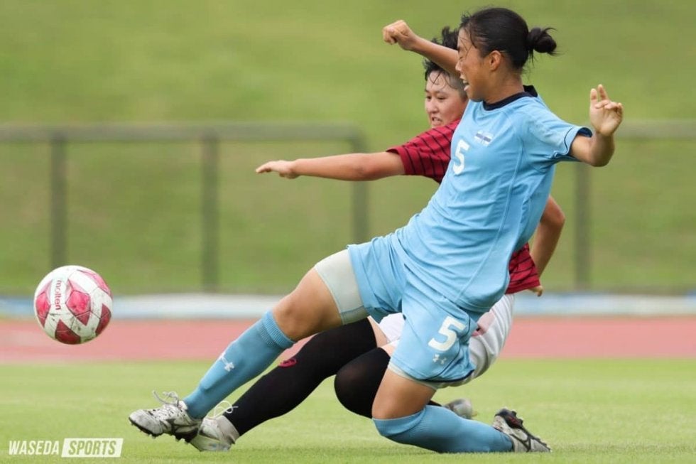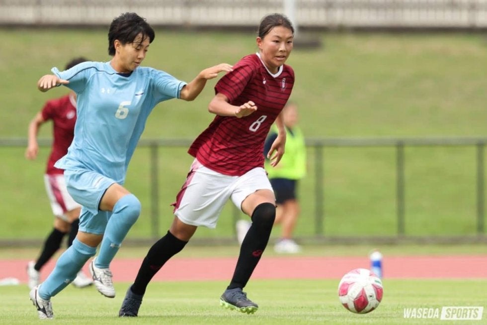 関東大学女子リーグ後期第5節の国際武道大学戦(9月6日、◯4-2)から中2日という過密日程のなか行われたこの試合だが、ア女はメンバーの変更をせず試合に臨んだ。試合開始直後は前からの積極的なプレスでボールを奪いシュートを放つシーンがあったものの、試合全体を通して相手がゲームの主導権を握る展開に。14分、相手選手に右サイドを突破され、カットインから放たれたミドルシュートはポスト直撃。跳ね返ったこぼれ球を押し込まれ失点する。反撃を試みるア女は24分、ビルドアップからMF築地育(スポ3=静岡・常葉大橘)へとボールを繋ぎ、その築地からのスルーパスに反応したMF三谷和華奈(スポ4=東京・十文字)が抜け出すが相手キーパーにキャッチされシュートまでいくことができず。29分には前からのプレスでMF笠原綺乃(スポ4=横須賀シーガルズJOY)がボール奪取し、そのままシュートを放つがこちらもキーパーに難なくキャッチされてしまう。決定機を作ることができなかったア女は、前半を0-1で折り返した。
