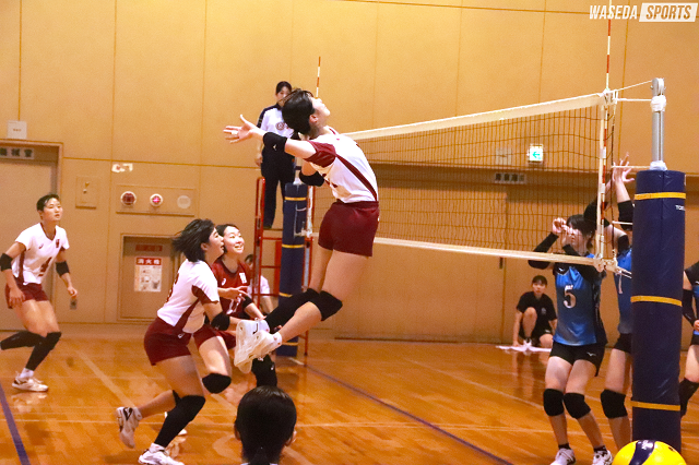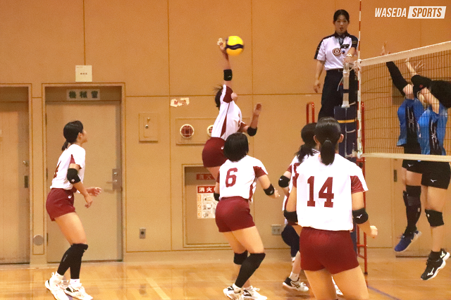 第1セット開始直後、大松未羽(スポ1=沖縄・首里)のサービスエース、ブロックポイントで序盤から流れをつかみにかかるが、スパイクミスやタッチネットで失点し3-6と相手のリードで試合が進む。だが、西崎梨乃(スポ1=大阪国際滝井)のダイレクトアタックなどでじわじわと差を縮め、秋重若菜主将(スポ3=大阪・金蘭会)のブロックの小指をはじく技ありの一発で9-8と逆転に成功する。完全に流れをつかんだ早大は、さらに神戸彩有(文構4=長野・松本県ヶ丘)がストレートコース際に鋭いスパイクを決め、この日最高潮の盛り上がりを見せた。流れのまま南里和(商3=東京・女子学院)が連続でサービスエースを決め21-17とし、その後秋重のスパイクなどで点数を重ね、25-21で第1セットをとる。