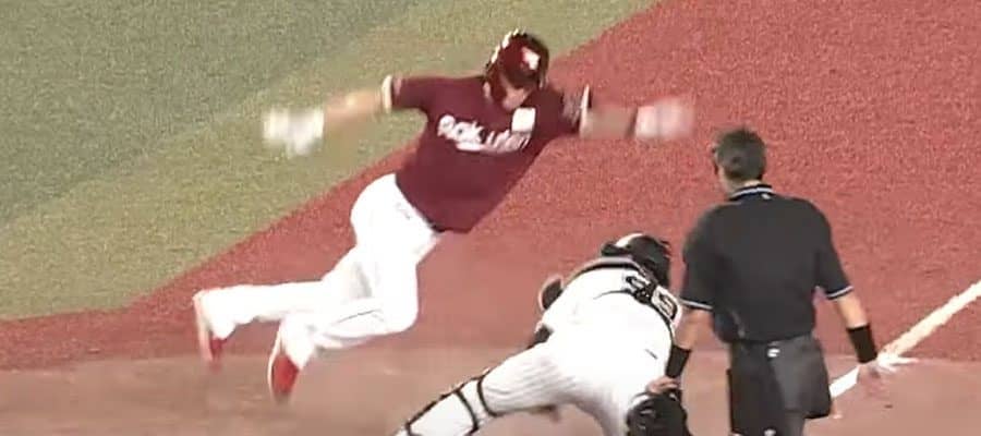 楽天辰己は華麗なジャンプで捕手をかわして貴重な1点をもぎ取った■楽天 5ー3 ロッテ(13日・ZOZOマリン) 楽天の辰…