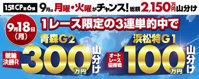 9月18日(月)は競輪の共同通信社杯G2(青森)決勝戦とオートレースの特別G1プレミアムカップ(浜松)で、それぞれ山分けキャンペーンを実施!