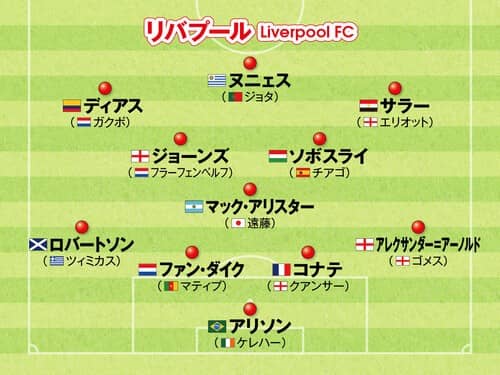 FW:ルイス・ディアス(コーディ・ガクポ)、ダルウィン・ヌニェス(ディオゴ・ジョタ)、モハメド・サラー(ハーベイ・エリオット)