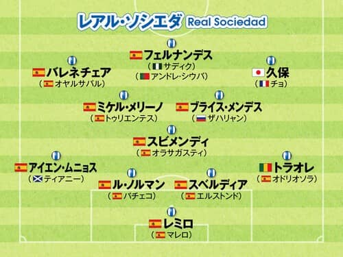 FW:アンデル・バレネチェア(ミケル・オヤルサバル)、カルロス・フェルナンデス(ウマル・サディク)(アンドレ・シウバ)、久保建英(モハメド・アリ・チョ)