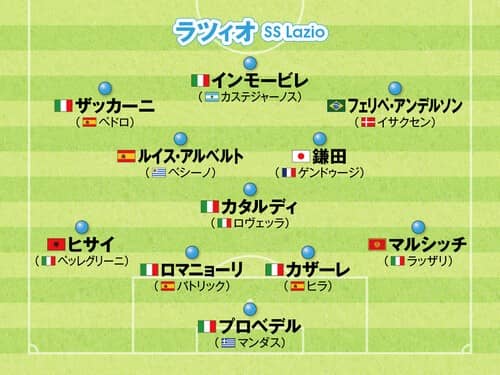 FW:マッティア・ザッカーニ(ペドロ・ゴンサレス)、チーロ・インモービレ(バレンティン・カステジャーノス)、フェリペ・アンデルソン(グスタフ・イサクセン)