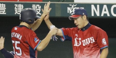 6回、浅村の適時打で生還した秋山(左)を迎える西武・菊池=メットライフドーム【写真提供:共同通信社】 埼玉西武が8対5で…