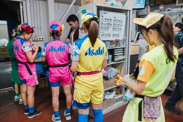 午後3時30分過ぎ。神宮球場の売り子たちが続々と出勤していた。8月半ばのこの日は、第1陣と第2陣を合わせた160人が、各ビールメーカーなどの色とりどりのユニフォームに着替え、朝礼を終えたあと、それぞれの基地(バックヤード)へ向かった。