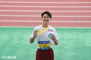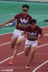 2日目に行われた決勝は3連覇を狙う福岡大や、同日に100メートルで表彰台を独占したメンバーがそろう甲南大など、強豪校がひしめく中でのレースとなった。早大はメンバーを変えずに臨み、1走の鷺は予選と同様0秒1台のリアクションタイムで好スタートを切る。2走の山越に強豪校とわずかな差でバトンを渡すと、山越は先行する甲南大を必死に追った。バトンパスで少し差をつけられたものの、3走の大川が懸命の走りを見せアンカーの中村へとつなぐ。甲南大と福岡大が先行し早大、青学大、日体大の3校が並ぶ展開で、直線勝負へと突入。中村は3位争いを繰り広げ、最終的には日体大にかわされたものの4位でゴール。表彰台にはあと一歩だったが、強豪校を相手に堂々の走りを見せ、入賞を果たした。
