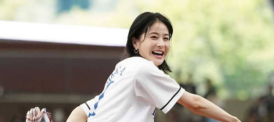 女優の松本若菜さんがベルーナドームの始球式に登場■ロッテ 2ー1 西武(18日・ベルーナドーム) 華麗な投球に場内が温か…