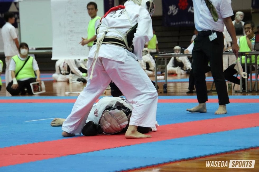 三段の金田が対するのは、高尾和幸四段(福岡県連盟)。「相手が強いことは知っていた」と言うように、実力で上回る相手に対して金田の狙いはカウンター。試合序盤は相手の出方を伺いながら隙を狙う展開に。間合いを詰めて突きを繰り出す相手に対し、冷静にいなしていく。試合が動いたのは開始45秒。金田は突きで面を狙うが、かわされて懐に入られる。すかさず膝蹴りで相手の胴を攻めるも、一本とはならず。すると相手に投げられ倒されてしまう。そのまま抑え込みを許し、一本を奪われた。後がなくなった金田は、「絶対取り返してやる」と果敢に攻めの姿勢を見せる。しかし、相手の足を掛けにいったところをかわされ、バランスを崩す。その隙を相手は見逃さず、そのまま倒されたところで背後から突きを許し、敗戦となった。