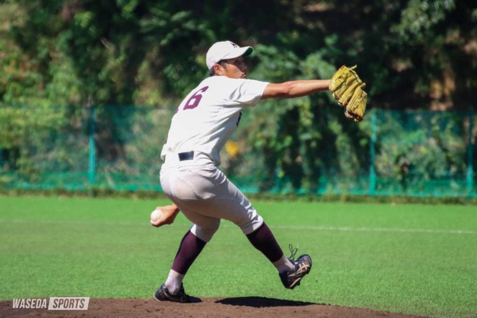 この日の早大の先発は、前回登板から中2日での先発となった大澤龍登(文構3=埼玉・星野)。この日の大澤は力強い直球で強力・法大打線を相手に好投する。4回には2つの四球でピンチを招いた大澤だったが、味方の堅い守備にも助けられ、無失点で切り抜けた。7回には味方の失策により1点を失ったものの、その走者をけん制球で刺してピンチを脱した。この日、大澤は7回を投げ、許した安打はわずかに2本のみ。失点は味方の失策による1点のみに抑える見事な投球だった。