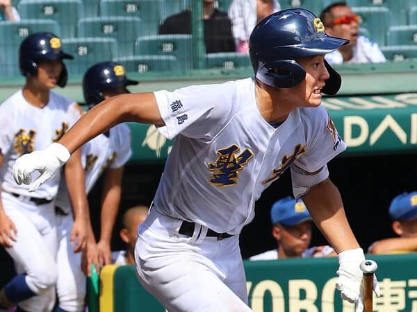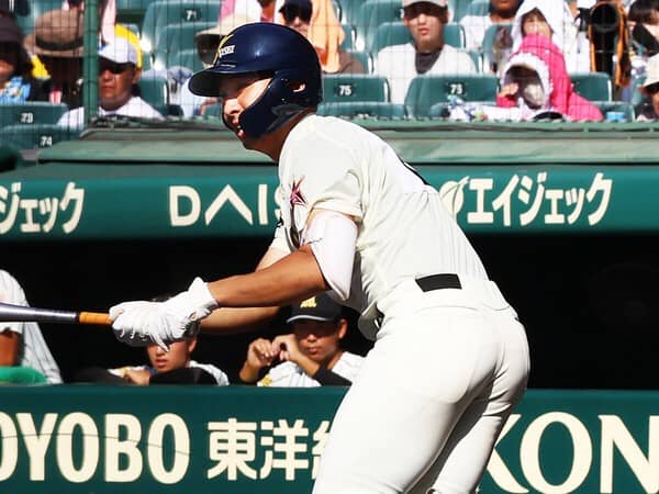 ひと振り見ただけでヒザ関節の柔らかさを感じ取れます。変化球に対してヒザを柔らかく使って対応し、バットヘッドをしならせてとらえる。タイミングをゆったりとれて、相手投手からすると吸い込まれるような、投げづらさを感じるフォームです。仙台育英との決勝戦では2ストライクと追い込まれた後、ノーステップ打法に切り替えて先頭打者本塁打を放ちました。ノーステップでも余計な力が入らずにゆったりと呼び込めて、インパクトの瞬間だけ力を込められる。体のバランスもいいし、まさにセンスの塊。プロの打者も見習ってほしいくらい理想的なスイングです。大学でも早い段階で戦力になれるでしょう。