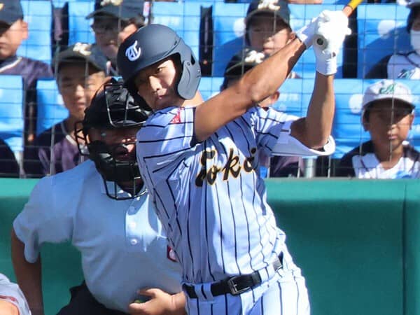 トップの形がよく、広角に強い打球を打てる右打者です。今大会は足をケガしていたそうですが、本来は足も速く、守備もうまい将来が楽しみな好素材です。ひとつ気になるのは、ボール球の見逃し方。私は打者を見る時、「見逃し方」を重視しています。ボール球だと判断してバットを止める際、その場でピタッとグリップが動かないのがいい打者。グリップが前に出てしまう打者は「時間がかかりそう」と感じてしまいます。百崎くんの場合もグリップがボールに近づいていってしまうので、力強いスイングを阻害している感があります。「空振りをしたくない」という思いが強すぎるのかもしれませんね。トップでボールと距離をとったままスイングできれば、右方向にも長打が出そうです。ぜひ「見逃し方」に取り組んでもらいたいですね。
