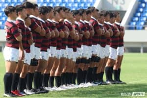 対抗戦初戦にて校歌合唱を行う早大選手たち