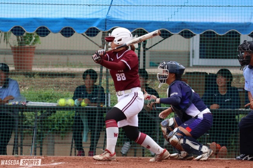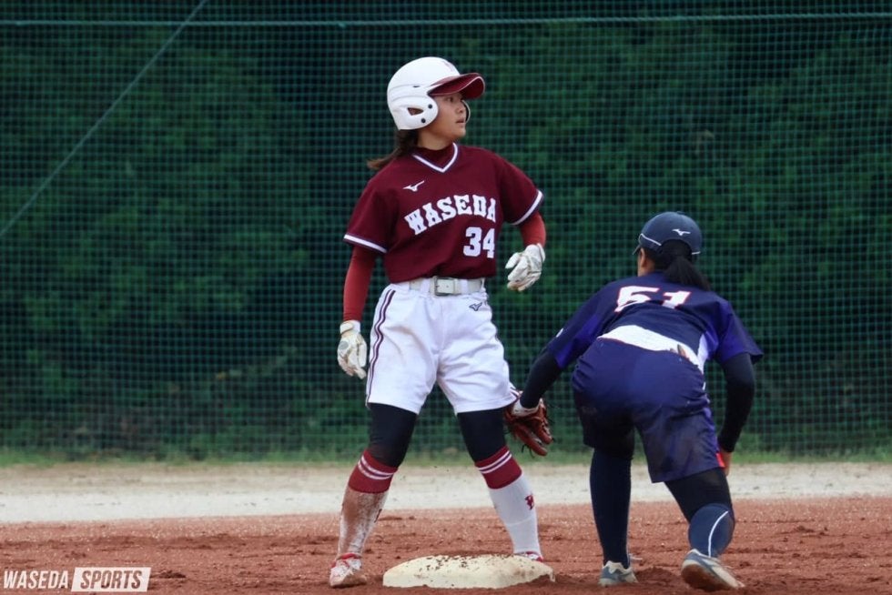 4点のビハインドを1点ずつでも返していきたい早大は、1回裏、先頭の瀧之上日向子(スポ1=埼玉・花咲徳栄)が二塁打でチャンスメイクをする。1死後、河井なごみ副将(スポ3=埼玉伊奈学園総合)の犠打で2死三塁の好機を迎える。しかし、4番の小林主将が三振に倒れ、得点には結び付かなかった。3回にも瀧之上がこの日2本目の安打を放ちマルチ安打をマーク。相手の暴投で得点圏に進んだが、ここも得点には結びつけることができない。不利な状況が続く中、逆に4回表には3番打者に適時打を打たれ、追加点を許してしまう。攻撃陣にあと一本が出ないまま、試合は最終回を迎えた。