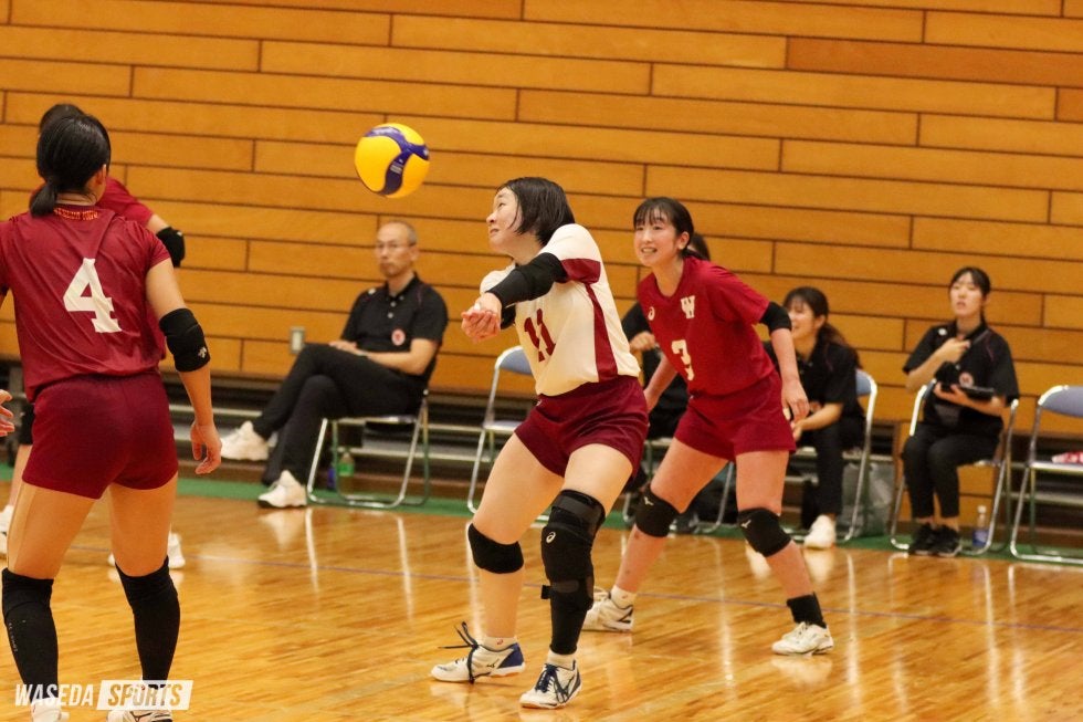 第1セット、大松美羽(スポ1=沖縄・首里)のライン際のスパイクや、南里和(商3=東京・女子学院)の2連続サービスエースなど、序盤から上々の立ち上がりを見せる。流れを掌握した早大は、先に20点台に乗るが、サーブミスなどの自陣のミスで20―16と差を縮められる。しかし、秋重若菜主将(スポ3=大阪・金蘭会)が渾身のバックアタックを決め、チームの士気を高める。そのまま、最後は相手のサーブミスで25点目を取り、1セット目を先取した。第2セットは終始一進一退の攻防戦が繰り広げられる。10-10の場面で秋重がレフトからのスパイクで3点を連取し、ブレイクする。しかし中盤、相手のクロスコースに決まるスパイクに苦しみ、20-20とまたも競った展開に。しかし、ここで西崎梨乃(スポ1=大阪国際滝井)のクイックでまたもブレイクする。再び流れを呼び込んだ早大、最後は相手のスパイクミスでセットを連取した。