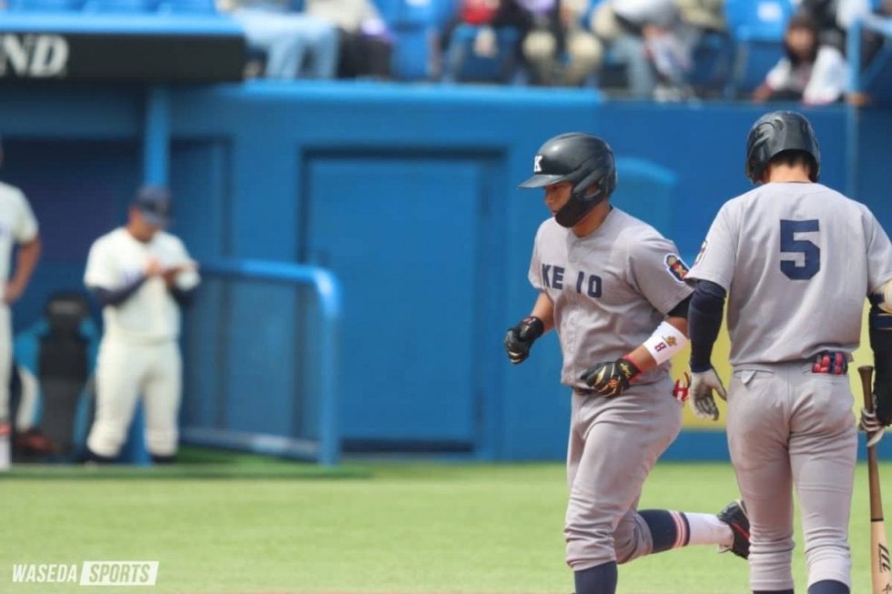 援護を受けた谷村は3回も無失点に抑えると、続く4回はこの試合初めての三者凡退に締めて流れを呼び込む。すると直後の攻撃で栗林泰が再び左翼本塁打を放ち追加点を挙げた。5回、谷村が1死二、三塁のピンチを迎える。続く打者に右前適時打を浴び、三塁走者が生還。二塁走者も本塁へ突入するも、栗林泰の好返球でアウトに仕留めた。慶大は栗林泰の攻守にわたる活躍でリードを守る。
