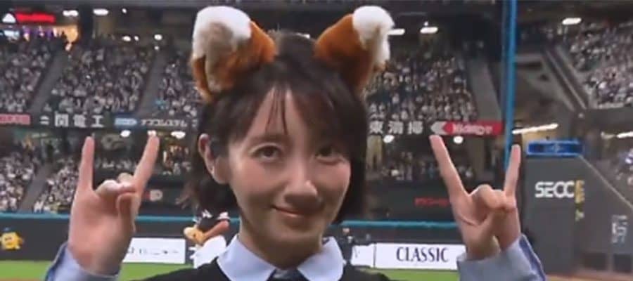 【実際の映像】まさかの…きつねに“変身”した波瑠さんが登場 キュートな耳&しっぽで新球場を魅了