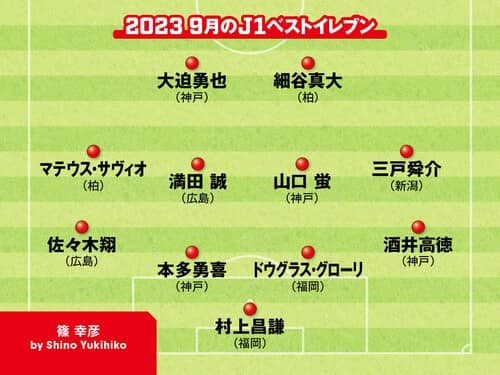 9月の4戦のうち、3勝を挙げたのは、ヴィッセル神戸、サンフレッチェ広島、アビスパ福岡、柏レイソルの4クラブ。好調を維持したこれらのクラブを中心にベスト11を選出した。