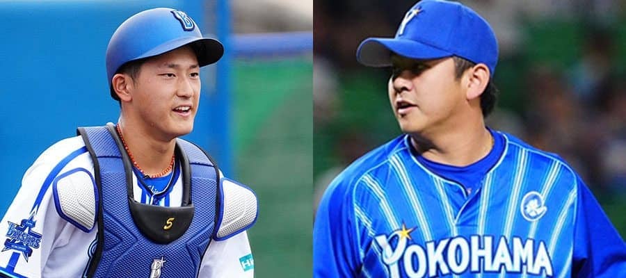 DeNA・松尾汐恩(左)と山崎康晃【写真:荒川祐史】