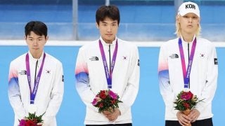 表彰台で悲痛な表情を浮かべたチョン・チョルウォン(左)。批判の声が止まない本人はSNSで新たに謝罪した。(C)Getty…