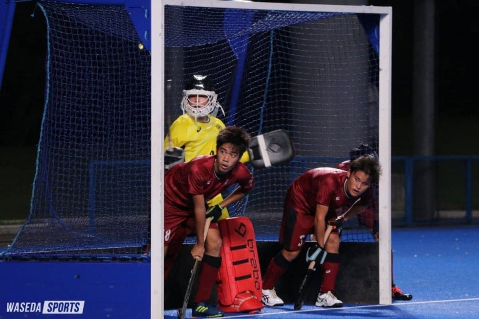 第1クォーター(Q)は早大ペースであった。約2分にFW岩本捷汰(スポ3=大阪星光)がドリブルでコート中盤から明大ゴールゾーン前までボールを進めると、その後は明大ゴールゾーン付近で両者がボールを奪い合う展開に。シュートとはいかないまでも、早大にチャンス多い盤面。明大もロングパスを多用し、前線 を押上げようともがいており、明大陣地でのドリブル合戦が繰り広げられた。続く2Qでも約1分にペナルティコーナー(PC)を獲得。得点まではいかないものの、前半でGKがセーブしたのは早大1回、明大3回と、攻撃が続けば十分シュートが決まる可能性がある場面であった。