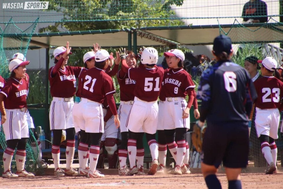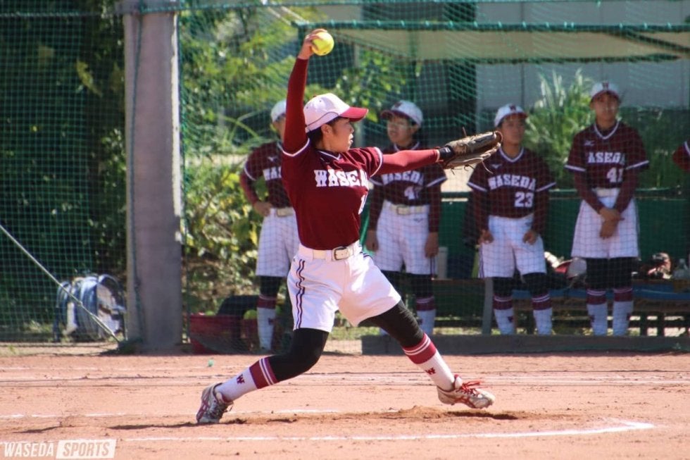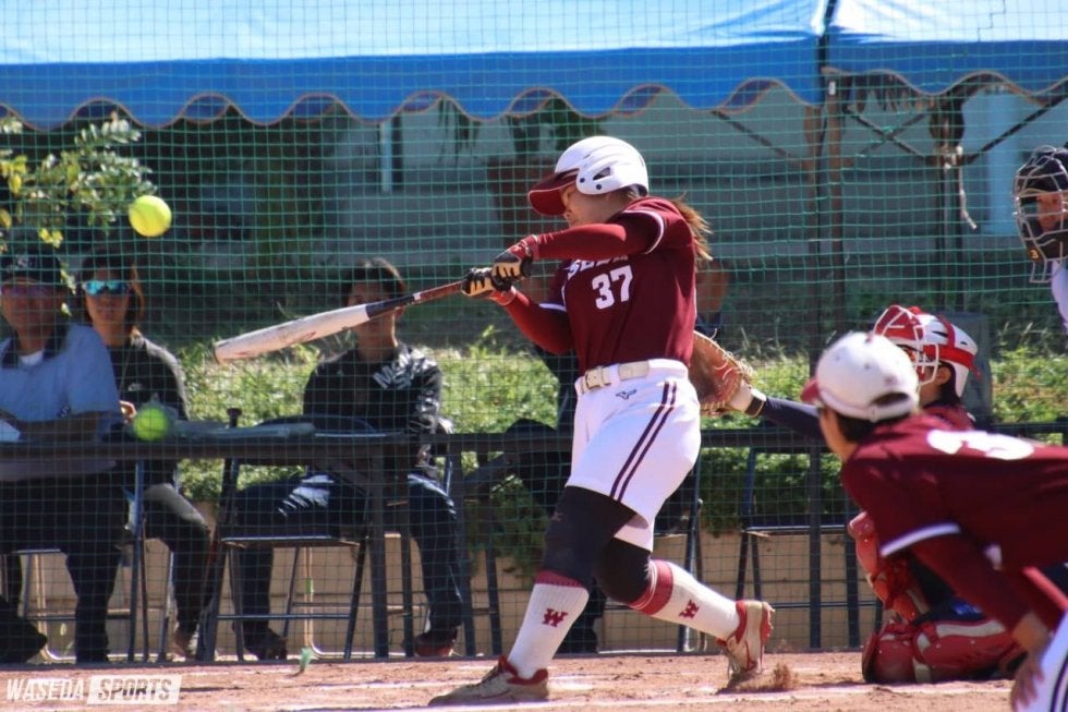 2回には2つの四球と鈴木美香(人3=香川・高松第一)の中前打で無死満塁に。続く小林の鋭い二直に一塁走者が飛び出し併殺打となるも、続く瀧之上日向子(スポ1=埼玉・花咲徳栄)の打球は二塁手の頭を超える。この間に2者が生還し、点差を4点に広げた。3回、先頭の矢口明歌梨(人2=東京・新宿)が放った中堅への飛球は日光と重なり、中堅手が見失う。打球が外野を転々とする間に矢口は三塁を陥れた。続く松井紗香(スポ1=兵庫・甲南女)は右中間へ大きな打球を放つと、野手の交錯などもあり打球は右中間を抜けていく。この間に松井自身も一気に生還し、リードを広げる。さらに杉浦櫻子(スポ2=愛知・岡崎北)、鈴木の連打で好機をつくると、小林が適時右前打を放つ。この回3点を加え、3回までに7点をリードした。