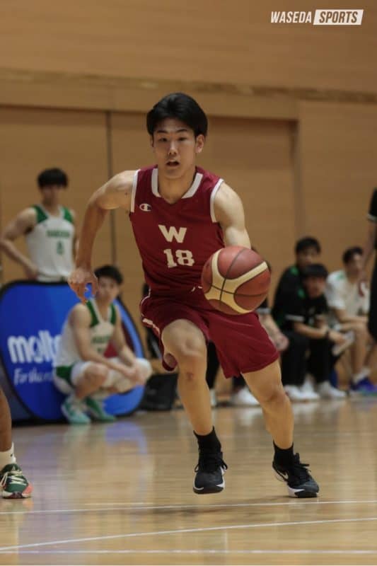 白鴎大にフリースローで1点を先制された早大。すぐにF星川堅信(スポ4=京都・洛南)がスリーポイントで取り返すと、G堀陽稀(スポ2=京都・東山)のドライブや、フリースローで確実に得点を重ねる。互角の戦いを見せた早大は、22ー24で第1Qを終えた。第2Qに入ると、序盤から白鴎大に3連続得点を許し、早大はすかさずタイムアウトで流れを切る。このタイムアウト明けにF三浦健一(スポ1=京都・洛南)がスリーポイントを決めると、ここから三浦のフリースロー、G岩屋頼(スポ2=京都・洛南)のアシストから堀の速攻シュートで、3連続得点を奪って勢いに乗る。白鴎大がタイムアウト後に流れを渡してしまった場面はあったものの、再び星川の連続スリーポイントで持ちこたえた早大。6点ビハインドの41ー47で前半を終えた。