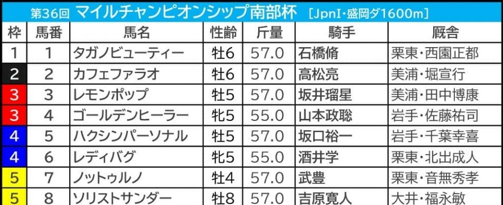 中央・地方全国指定交流競走の第36回マイルチャンピオンシップ南部杯(JpnI、ダ1600m)が9日(18時15分発走)、盛岡競馬場で行われる。